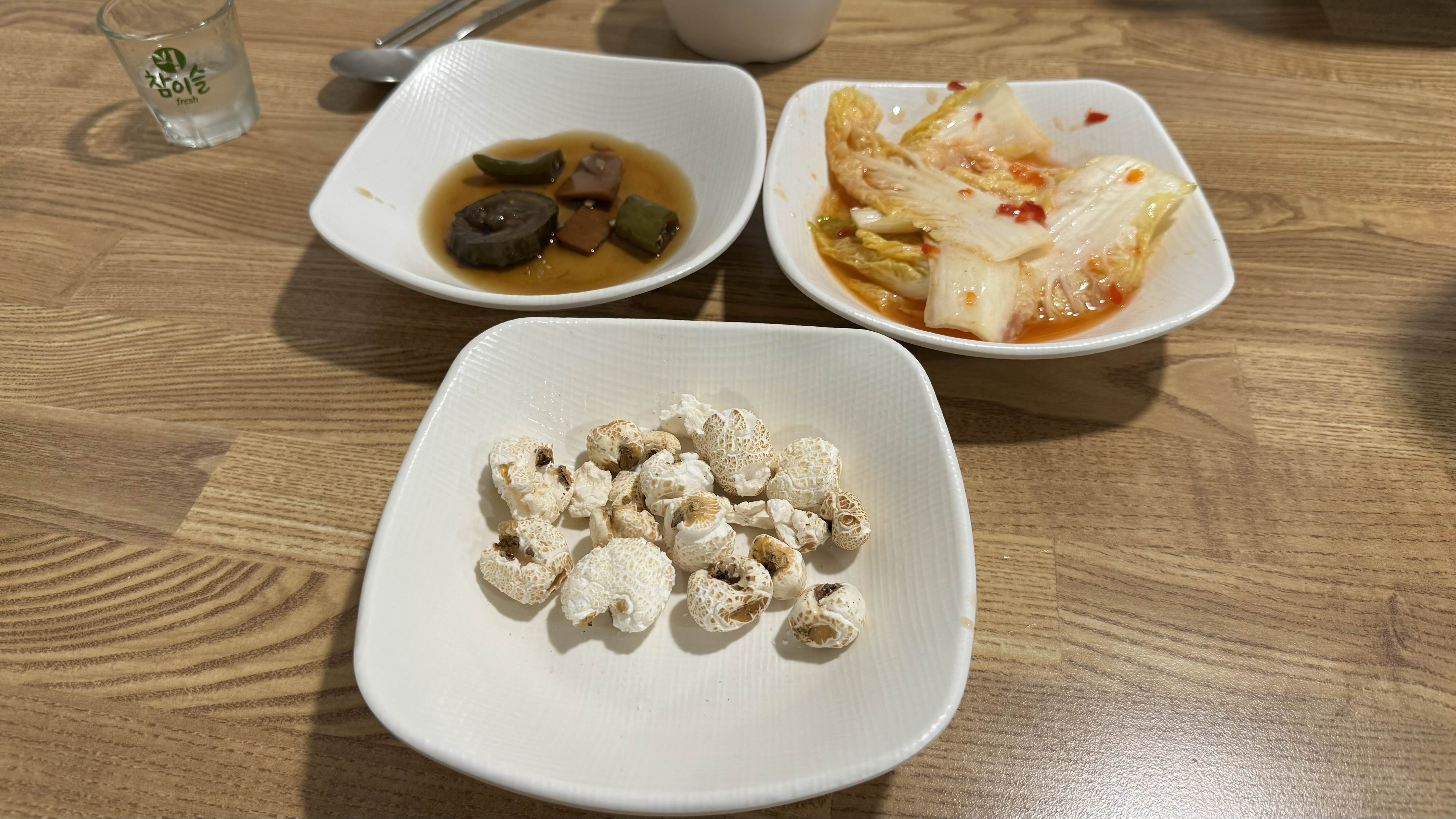 밑반찬은 장아찌, 물김치, 강냉이랑 충무김밥이 나왔습니다.