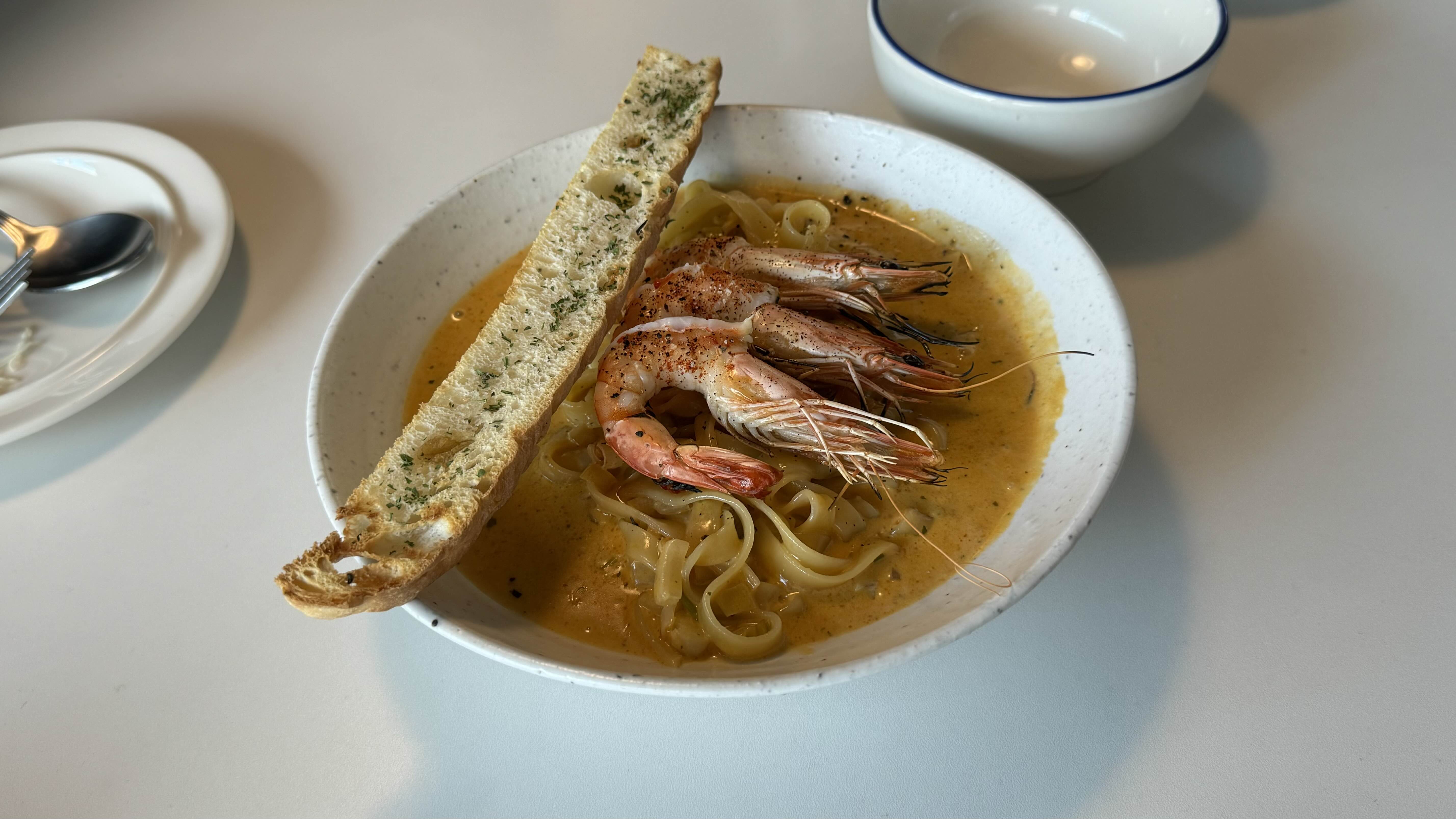 큰 새우 세 마리와 바게트가 올려져 있고 소스를 듬뿍 주셔서 너무 좋았습니다.