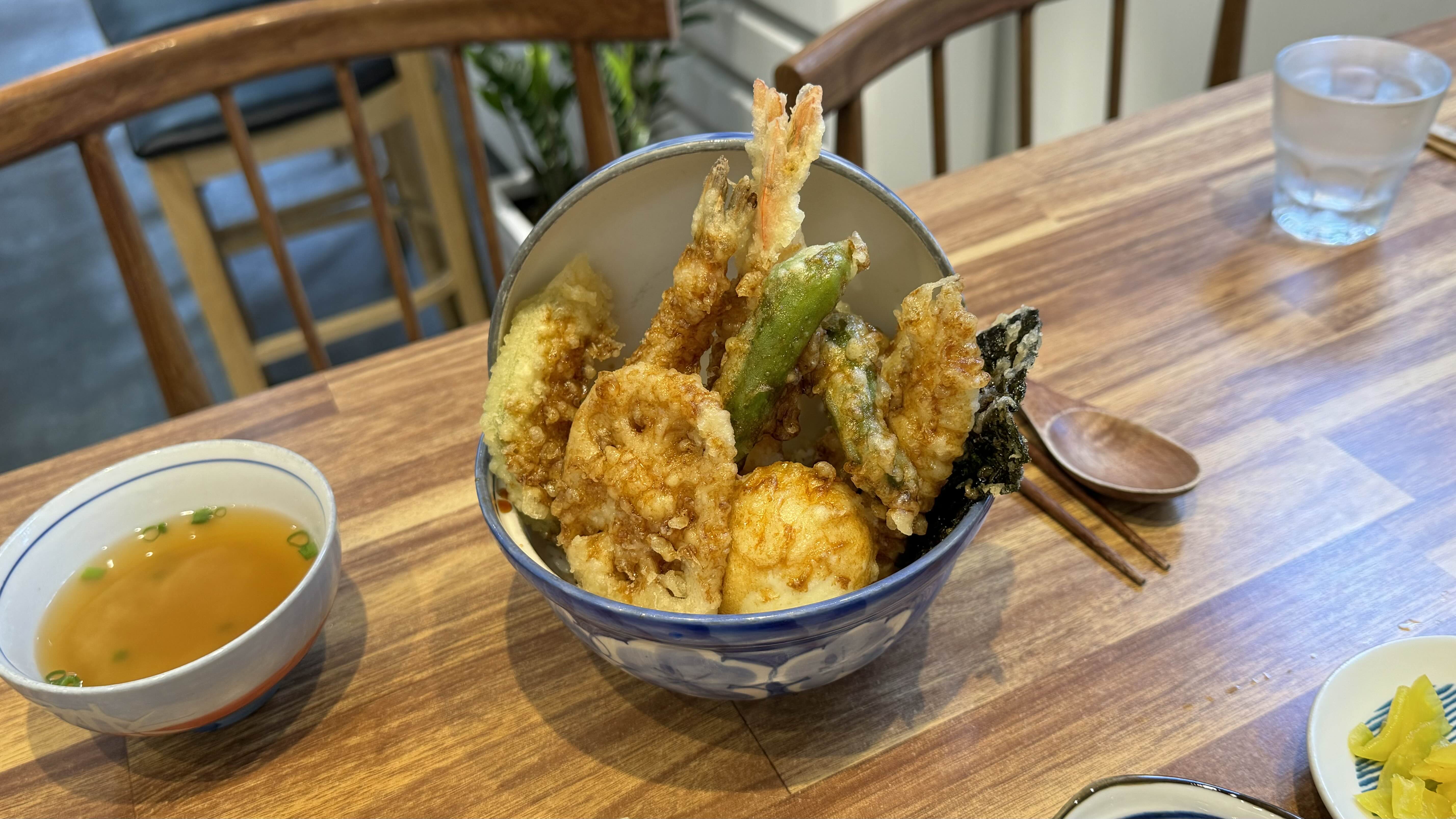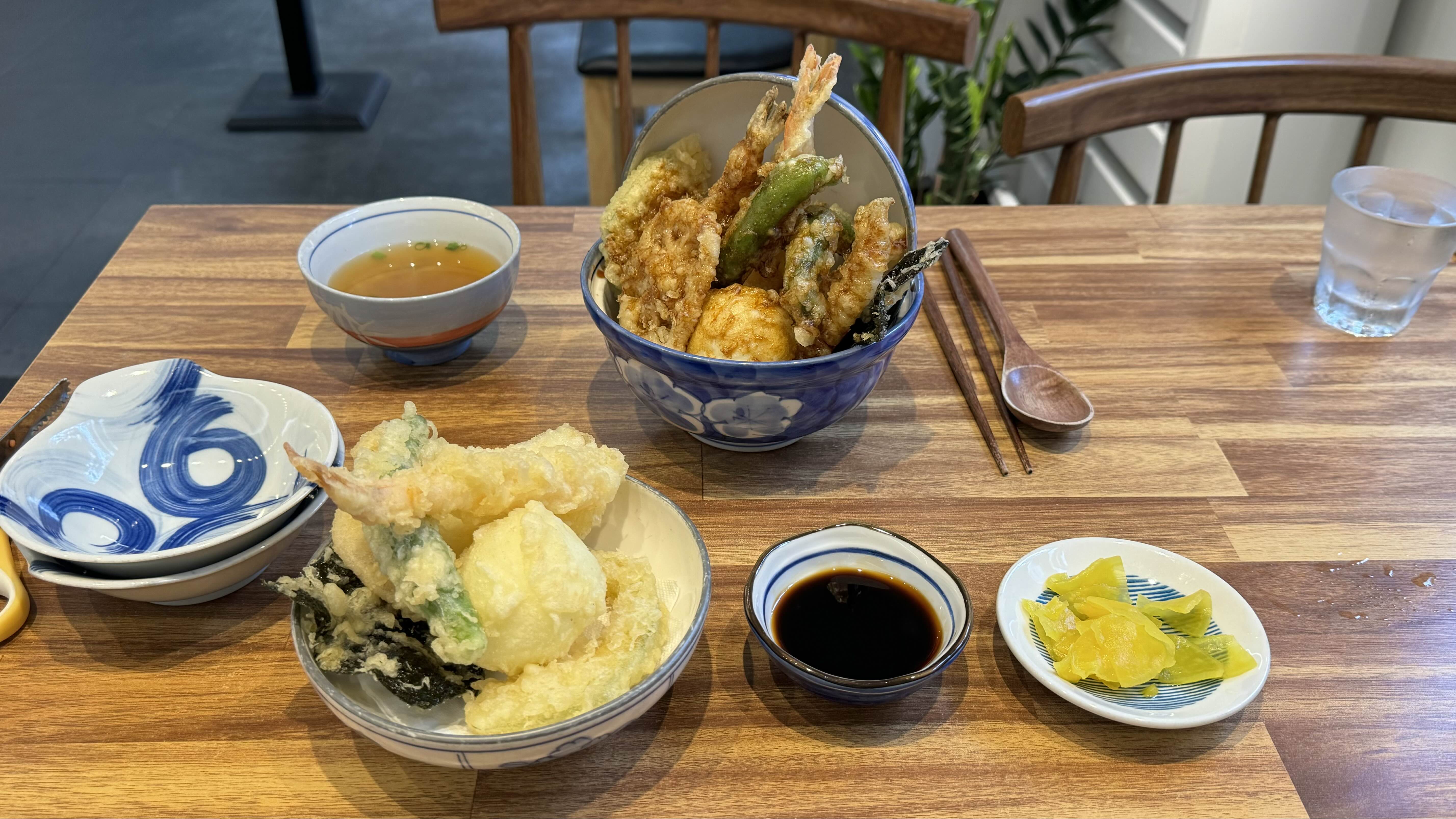 메인 메뉴인 텐동과 모둠 튀김입니다.