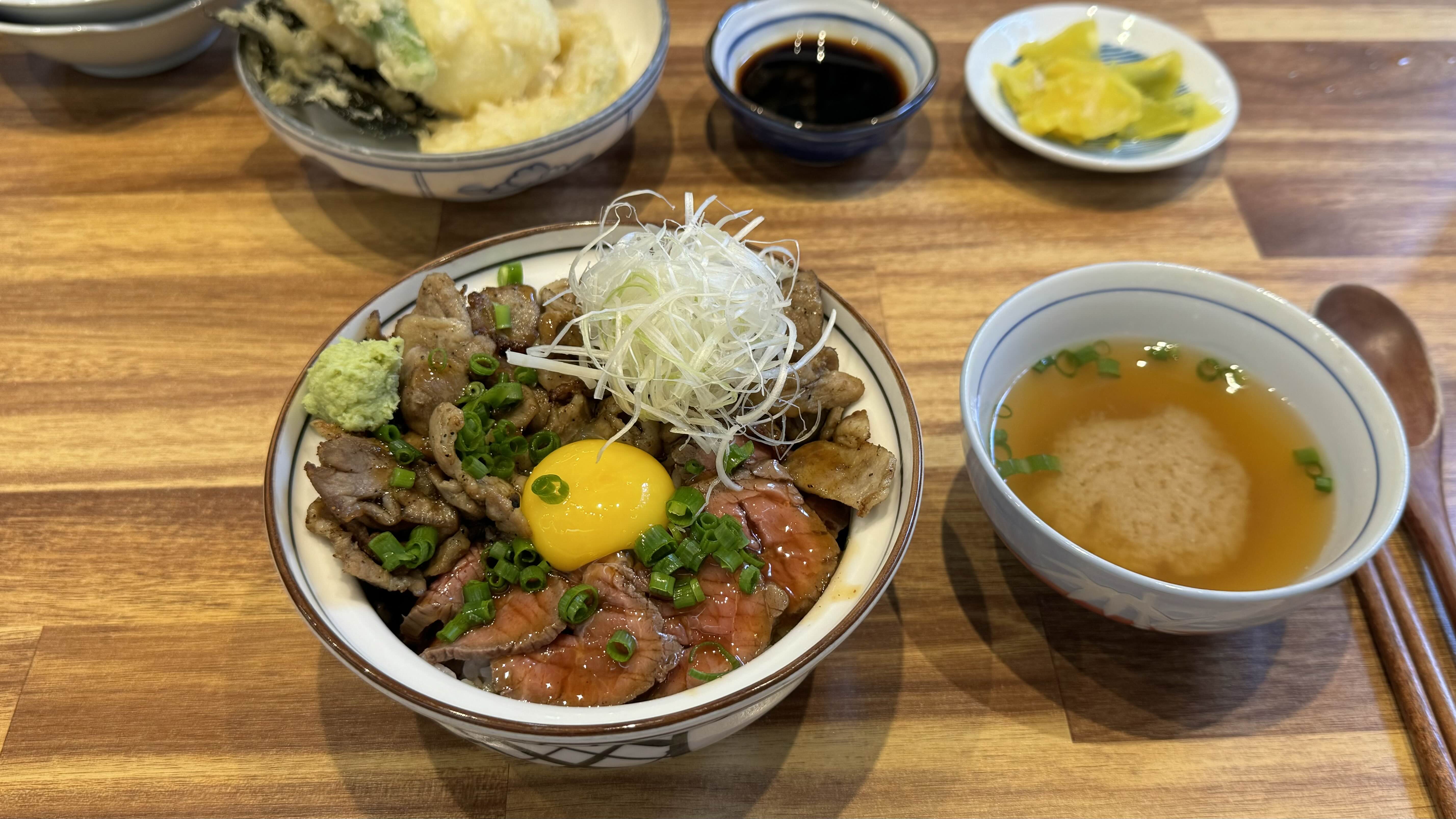 텐동, 장어 텐동, 니쿠동, 사케동 그리고 면 종류가 있습니다.