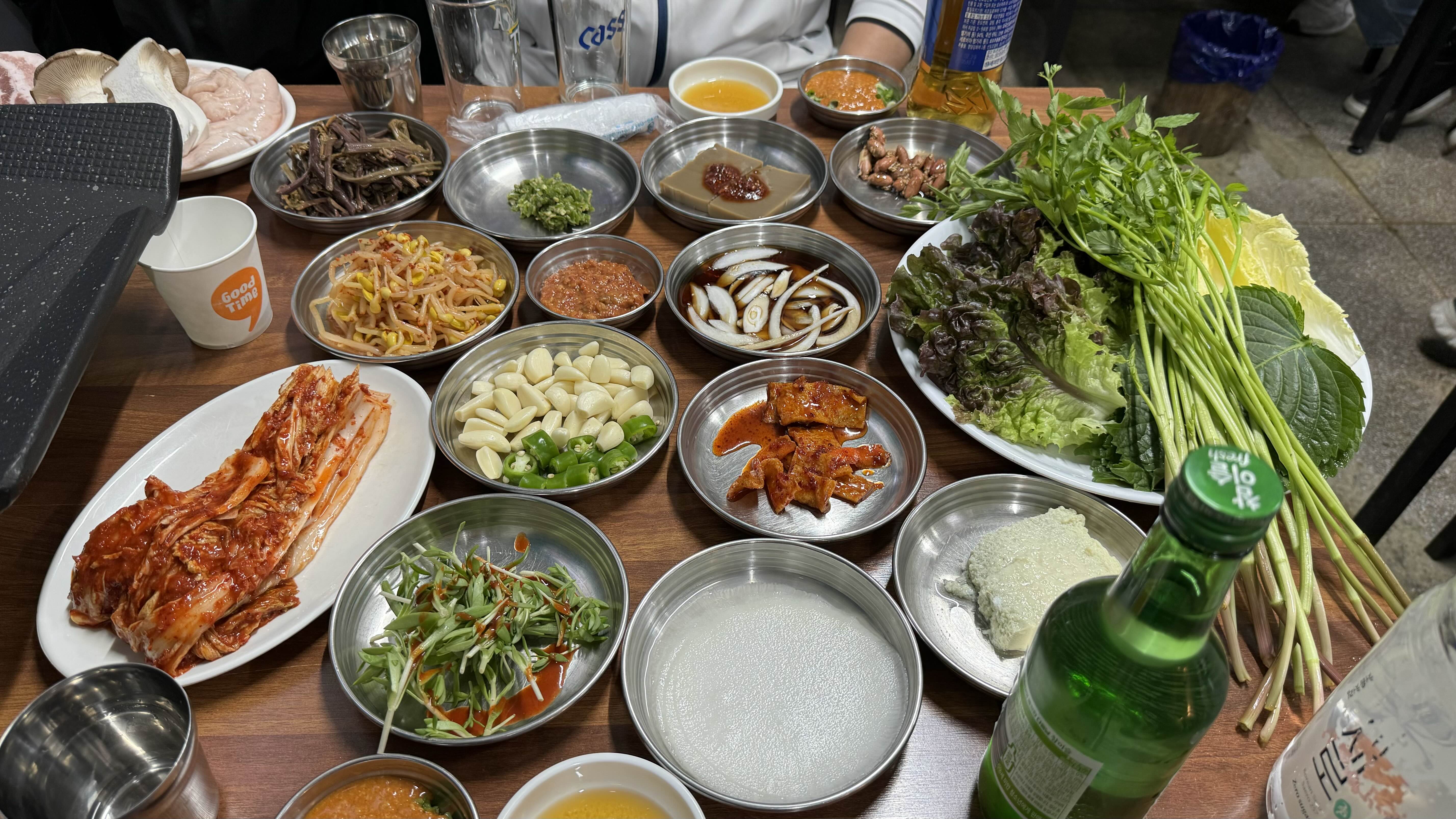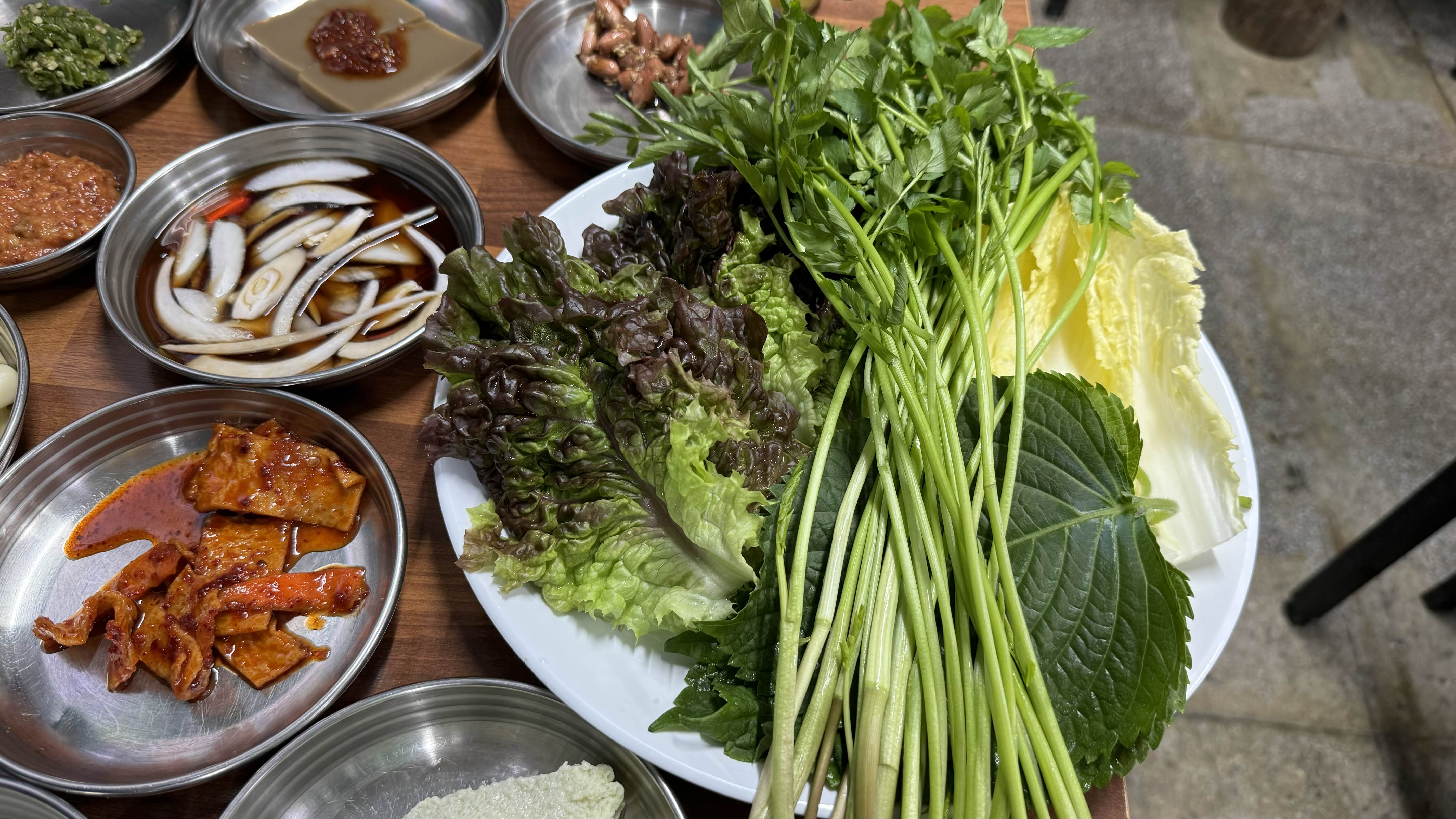 푸짐하고 맛있는 반찬들이 상을 꽉 채웠고 쌈채소 정말 다양하고 신선합니다.