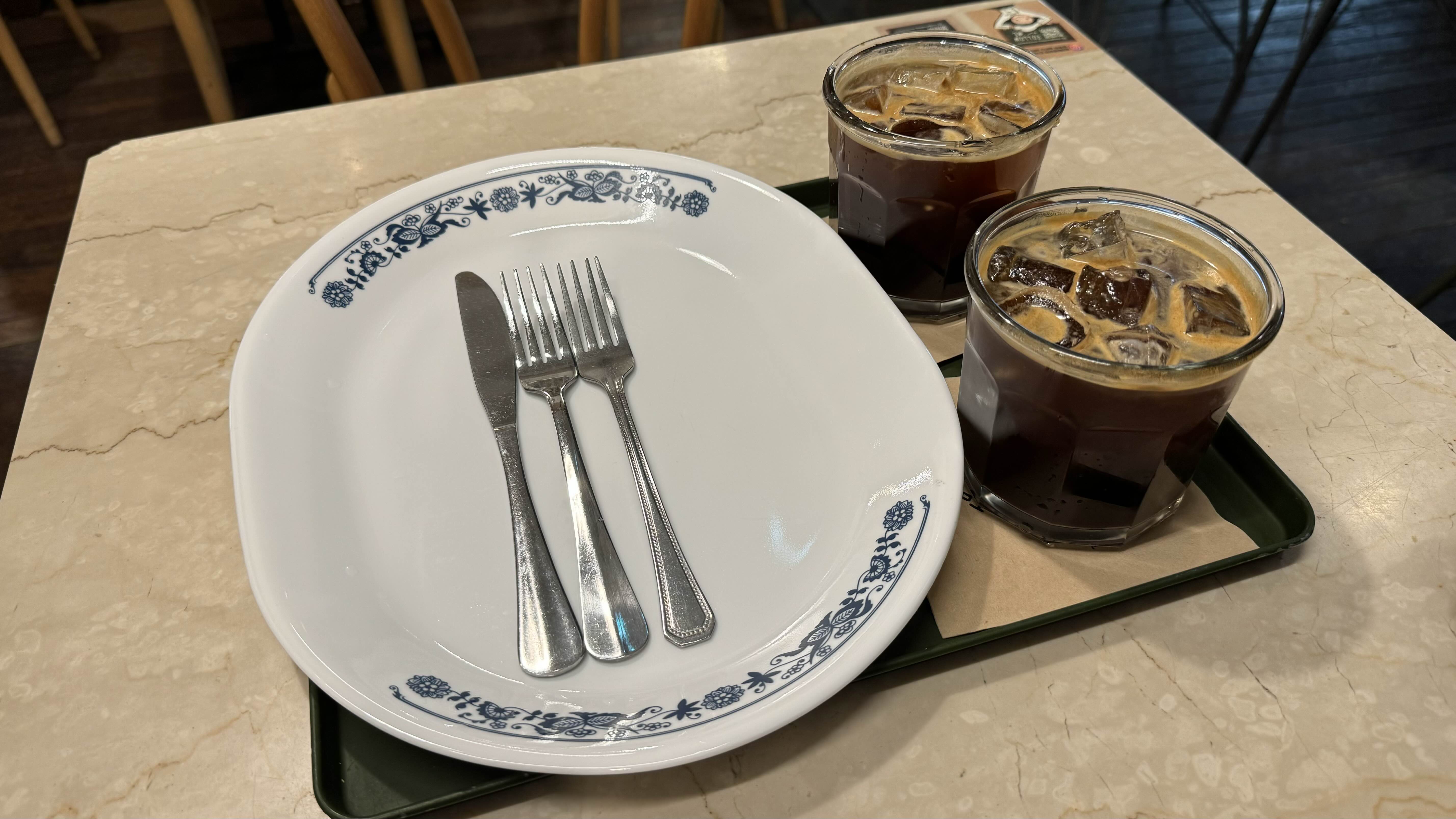 아이스 아메리카노 두 잔을 주문했고 빵을 먹는다고 하니 큰 접시와 포크, 나이프를 같이 주셨습니다.