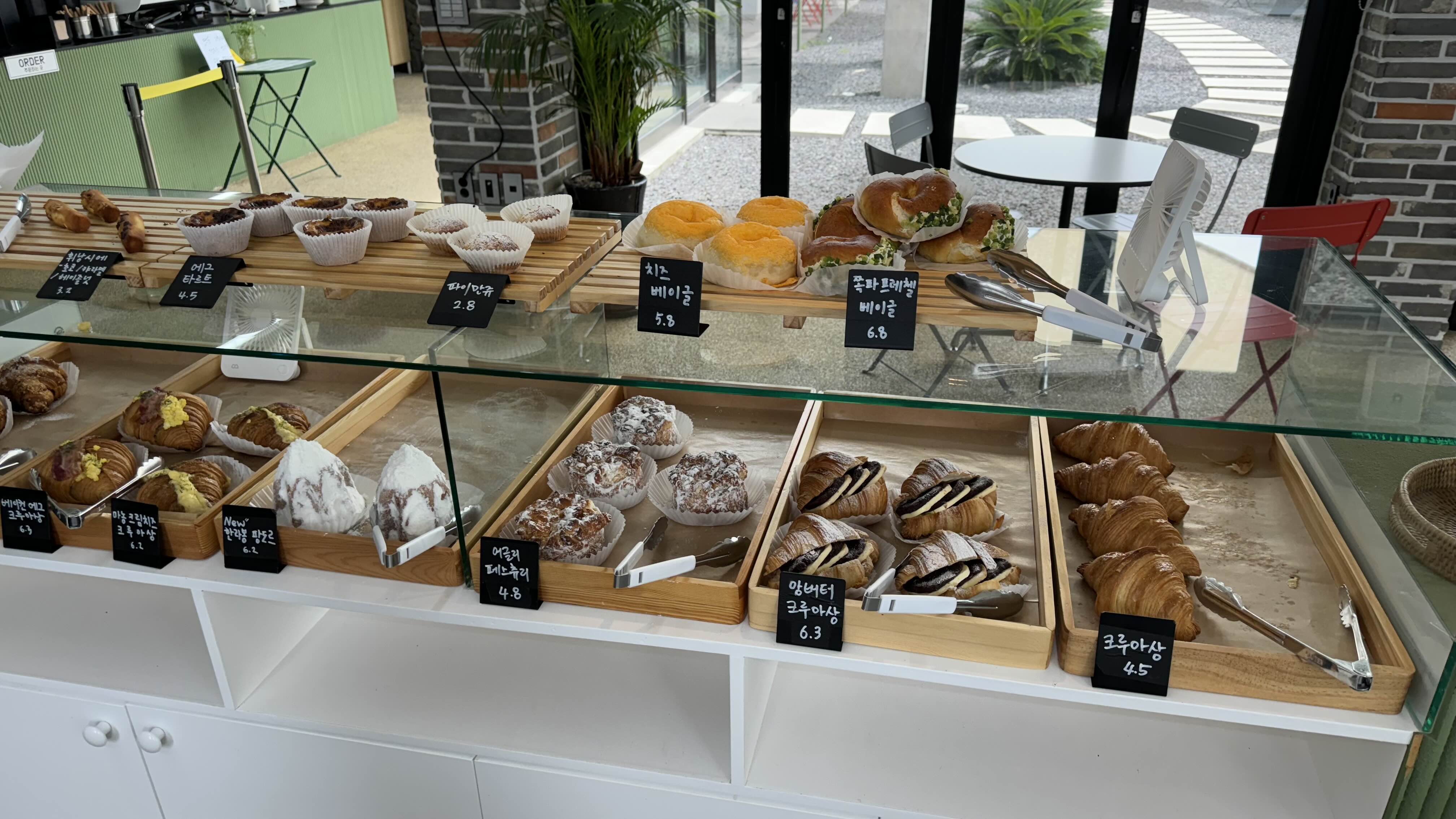 여기는 빵들이 있고 카운터 옆 냉장고엔 케이크가 있습니다.