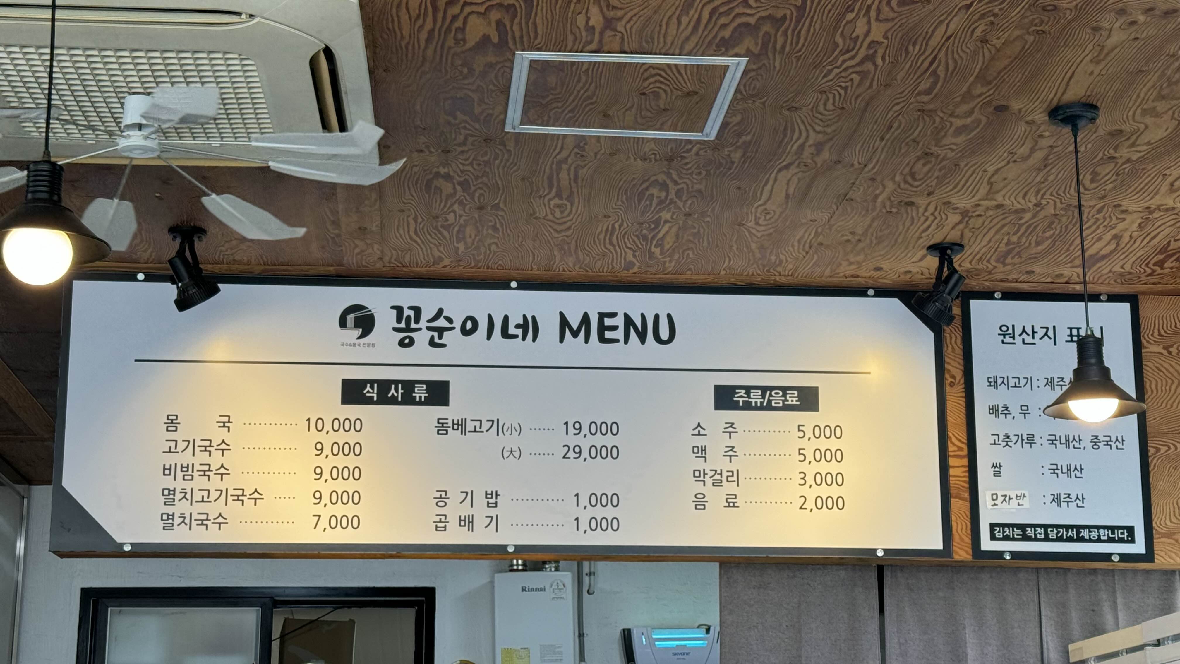 메뉴는 몸국, 고기국수, 비빔국수 등과 돔베고기가 있습니다.