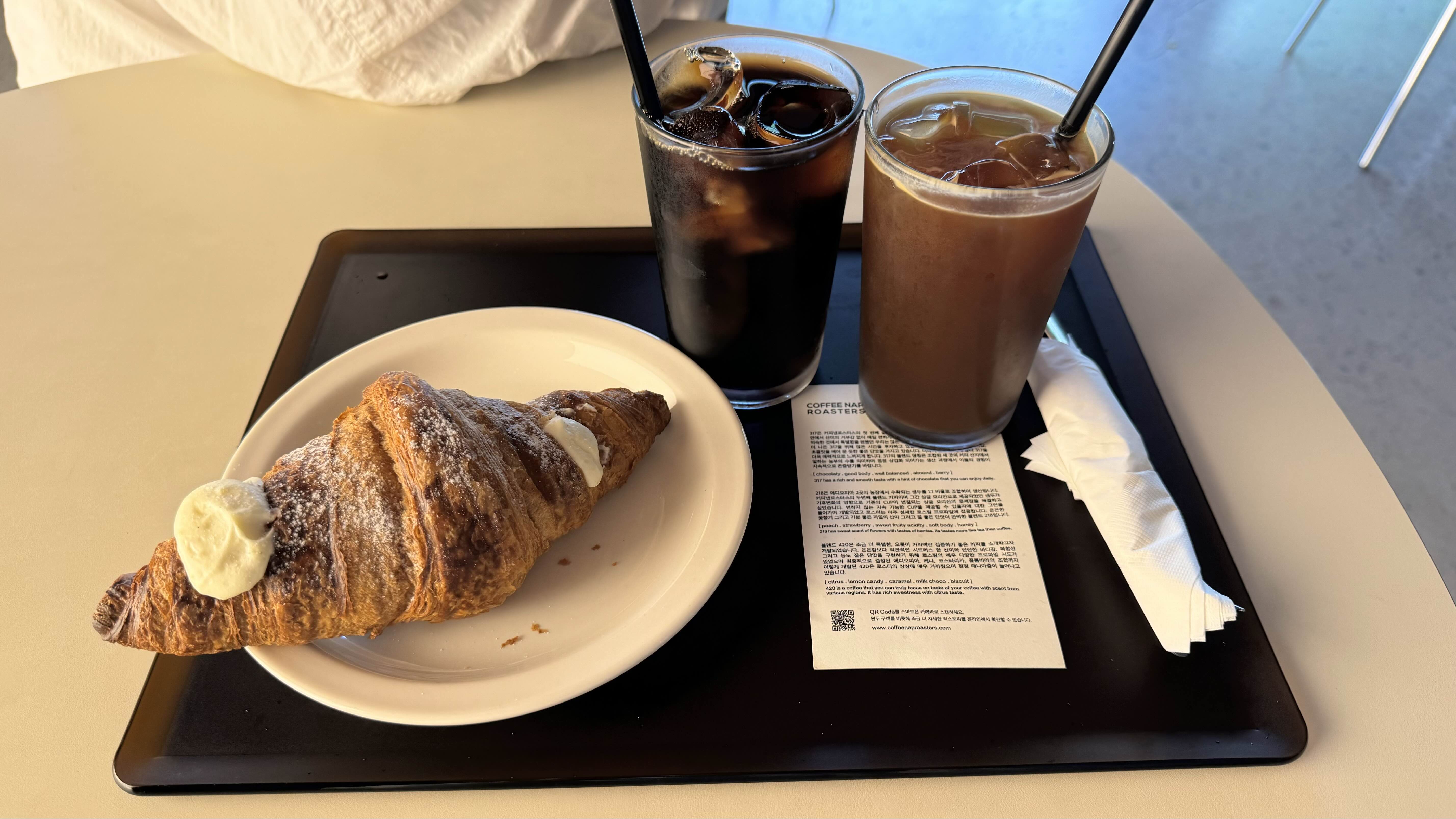 크림 크로와상이랑 커피 두 잔을 시켰습니다.